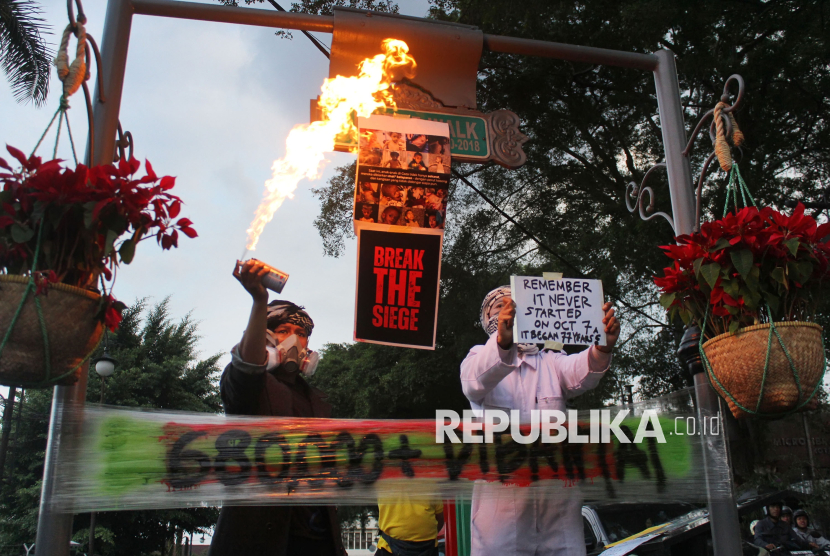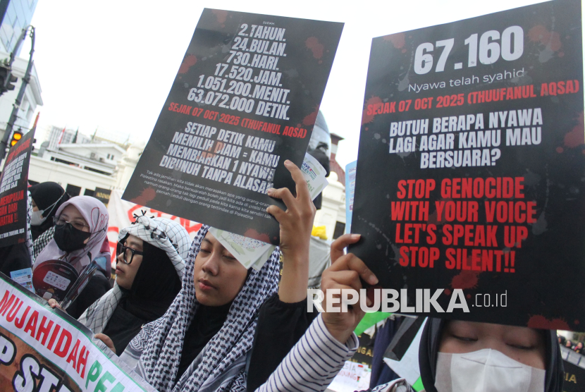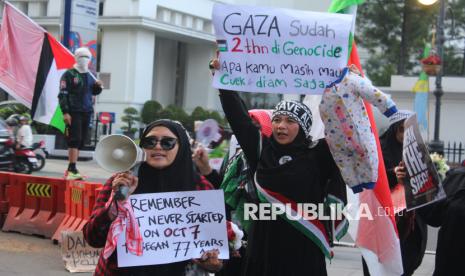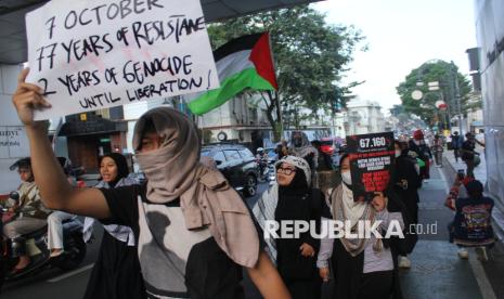 Massa yang tegabung dalam Solidaritas Seni untuk Palestina menggelar aksi memperingati dua tahun tragedi kemanusiaan di Gaza, di Palestina Walk, Jalan Asia Afrika, Kota Bandung, Selasa (7/10/2025). Aksi tersebut menyerukan agar masyarakat memboikot produk yang terafiliasi dengan Israel dan hentikan genosida kepada warga Palestina. (FOTO : Edi Yusuf/Republika)