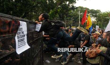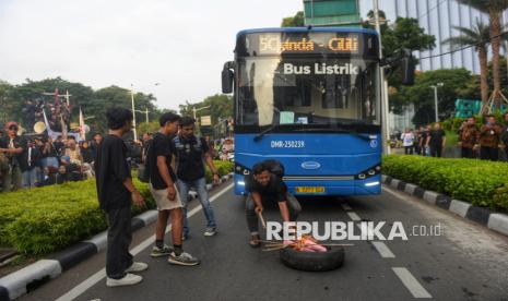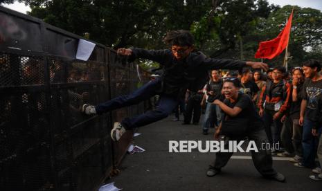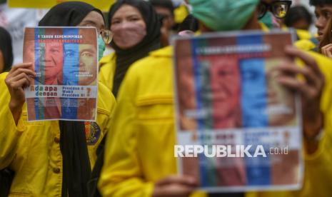 Sejumlah mahasiswa menggelar aksi demonstrasi dalam rangka memperingati satu tahun pemerintahan Presiden Prabowo Subianto dan Wakil Presiden Gibran Rakabuming Raka di kawasan Patung Kuda, Monas, Jakarta, Senin (20/10/2025). Dalam aksi tersebut, mahasiswa menyampaikan sejumlah tuntutan terkait program prioritas pemerintah yang dinilai belum menjawab kebutuhan rakyat. Mulai dari program makan bergizi gratis hingga reformasi pendidikan yang dianggap masih gagal memenuhi harapan masyarakat. (FOTO : Republika/Prayogi)