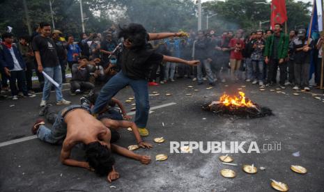 Sejumlah mahasiswa melakukan teaterikal saat menggelar aksi demonstrasi dalam rangka memperingati satu tahun pemerintahan Presiden Prabowo Subianto dan Wakil Presiden Gibran Rakabuming Raka di kawasan Patung Kuda, Monas, Jakarta, Senin (20/10/2025). Dalam aksi tersebut, mahasiswa menyampaikan sejumlah tuntutan terkait program prioritas pemerintah yang dinilai belum menjawab kebutuhan rakyat. Mulai dari program makan bergizi gratis hingga reformasi pendidikan yang dianggap masih gagal memenuhi harapan masyarakat. (FOTO : Republika/Prayogi)