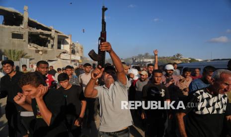 Seorang pria menembakan senjata ke udara saat pemakaman warga Palestina yang tewas akibat tembakan Israel, di Deir al-Balah, Jalur Gaza, Ahad (19/10/2025). Sumber-sumber medis melaporkan bahwa lebih dari 40 orang gugur syahid dan puluhan lainnya terluka di seluruh Jalur Gaza Palestina akibat serangan Israel yang menargetkan tenda dan sekolah yang menaungi para pengungsi, serta gedung tempat para jurnalis bekerja. (FOTO : AP Photo/Abdel Kareem Hana)
