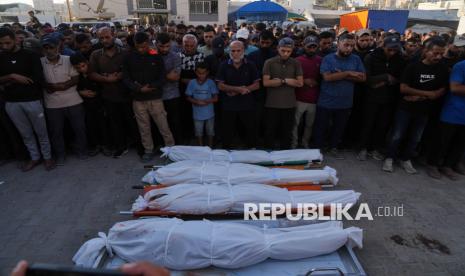 Warga melakukan sholat jenazah saat pemakaman warga Palestina yang tewas akibat tembakan Israel, di Deir al-Balah, Jalur Gaza, Ahad (19/10/2025). Israel melancarkan serangan udara dan artileri menargetkan wilayah di Jalur Gaza dari utara ke selatan ditengah perjanjian gencatan senjata. Sumber-sumber medis melaporkan bahwa lebih dari 40 orang gugur syahid dan puluhan lainnya terluka di seluruh Jalur Gaza Palestina akibat serangan Israel yang menargetkan tenda dan sekolah yang menaungi para pengungsi, serta gedung tempat para jurnalis bekerja. (FOTO : AP Photo/Abdel Kareem Hana)