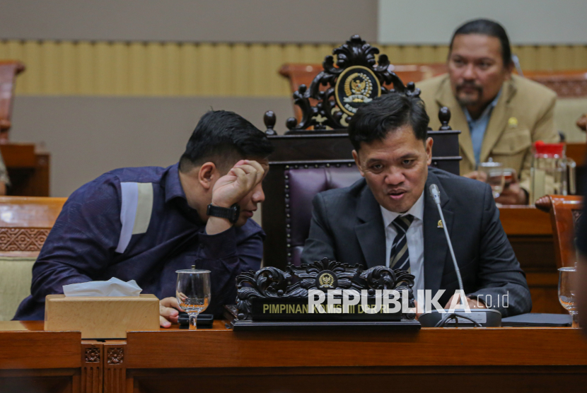 Ketua Komisi III DPR Habiburokhman (kanan) bersama Anggota Komisi VI Kawendra Lukistian (kiri) mengikuti Rapat Dengar Pendapat Umum (RDPU) terkait kasus videografer Amsal Christy Sitepu yang dituduh melakukan korupsi anggaran proyek video profil desa di Kompleks Parlemen, Senayan, Jakarta, Senin (30/3/2026). Komisi III DPR menyatakan secara substantif kerja kreatif videografer tidak memiliki harga tertentu sehingga tidak bisa dikatakan terjadi penggelembungan atau mark up dari harga baku serta menyerukan agar Majelis Hakim mempertimbangkan putusan bebas atau setidaknya ringan berdasarkan fakta persidangan. (FOTO : Republika/Thoudy Badai)