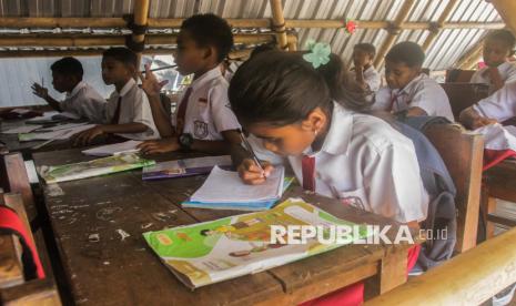 REPUBLIKA.CO.ID, NTT -- Sejumlah murid yang merupakan penyintas bencana erupsi Gunung Lewotobi Laki-laki pada 2024 belajar di ruang belajar sementara Sekolah Ceria, Desa Konga, Flores Timur, Nusa Tenggara Timur, Senin (20/10/2025).