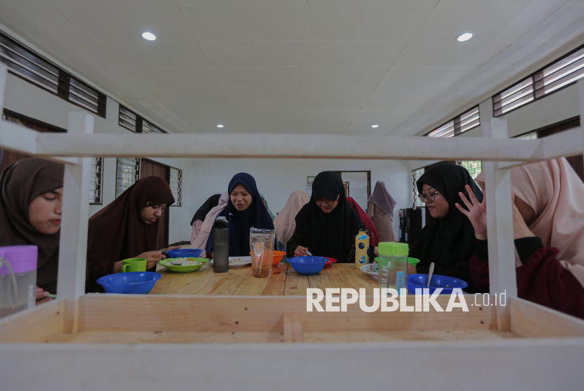 Santriwati penyandang tunarungu menyantap makanan saat waktu istirahat di Pesantren Tahfiz Difabel, Lebak Bulus, Jakarta, Rabu (22/10/2025). (FOTO : Republika/Thoudy Badai)