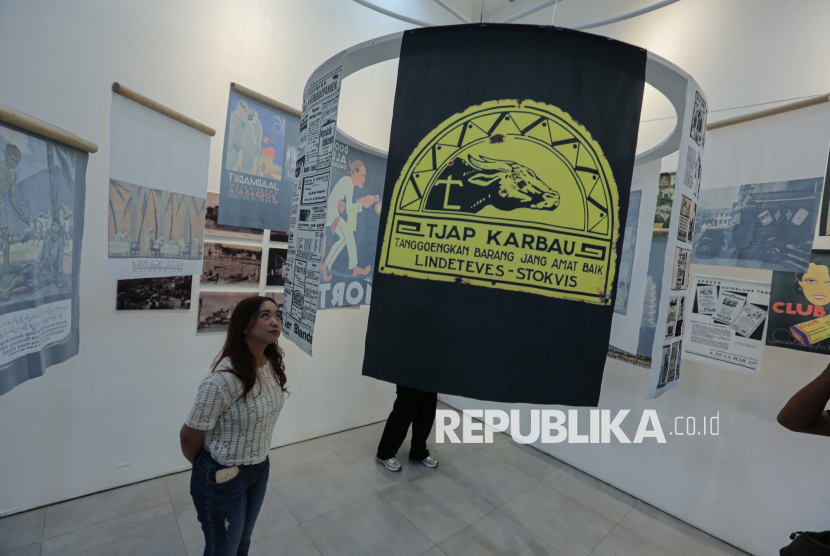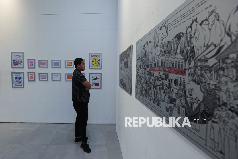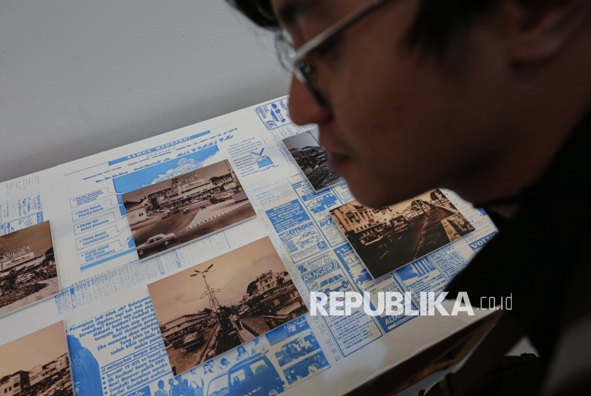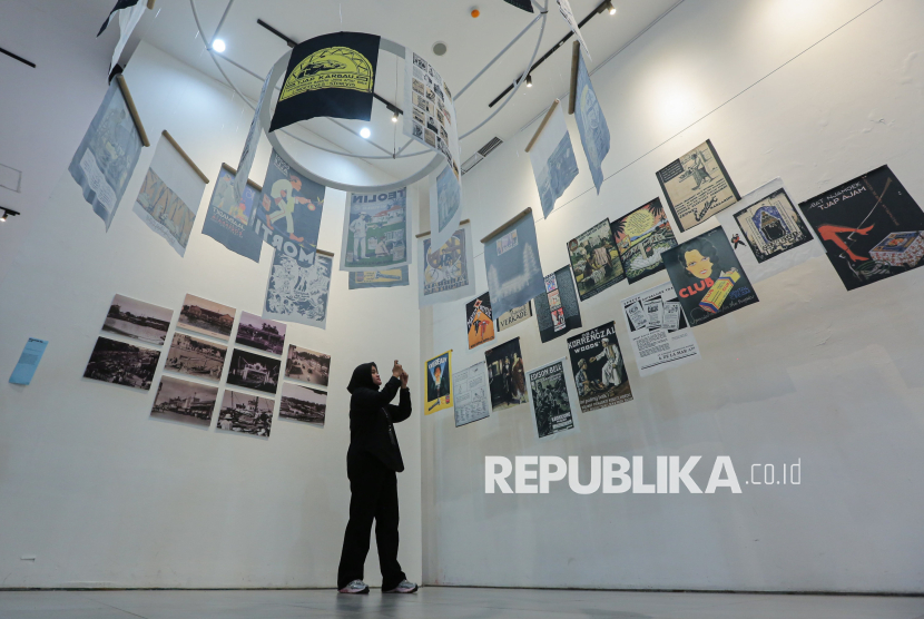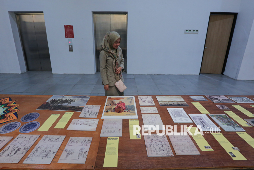 Pengunjung mengamati karya arsip dalam pameran PustaKarsa 2025 di Taman Ismail Marzuki (TIM), Jakarta, Selasa (14/10/2025). Pameran PustaKarsa bertajuk Lo Jual Gue Beli ini menyajikan beragam dokumentasi arsip kota Jakarta, karya sastra dan budaya yang menunjukan dinamika sosial ekonomi dari masa ke masa. Pameran yang digelar oleh Dinas Perpustakaan dan Kearsipan (Dispusip) DKI Jakarta tersebut berlangsung hingga 22 Oktober 2025 yang diharapkan menjadi ruang interaksi sosial sekaligus sarana edukasi mengenai sejarah kota Jakarta. (FOTO : Republika/Thoudy Badai)