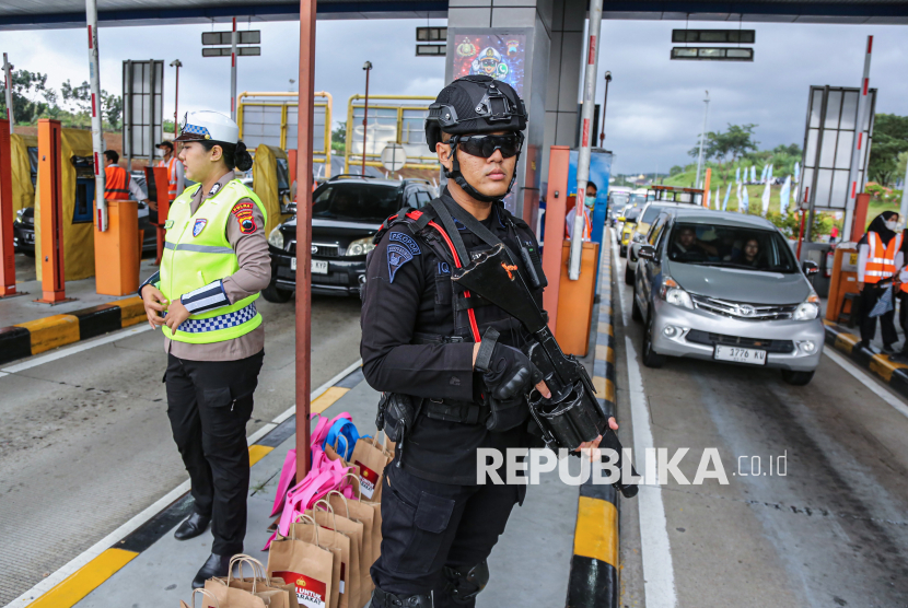 Anggota kepolisian melakukan pengamanan arus lalu lintas kendaraan pemudik di Gerbang Tol Kalikangkung Semarang-Batang, Semarang, Jawa Tengah, Selasa (24/3/2026). PT Jasamarga Transjawa Tol bersama Korlantas Polri memberlakukan skema satu arah (one way) nasional arus balik dari KM 414 GT Kalikangkung Semarang-Batang hingga KM 70 GT Cikampek Utama Jakarta-Cikampek pada Selasa (24/3) sampai Ahad (29/3) yang akan berlaku selama 24 jam secara situasional sebagai upaya memperlancar arus balik Lebaran 1447 Hijriah. (FOTO : ANTARA FOTO/Makna Zaezar)