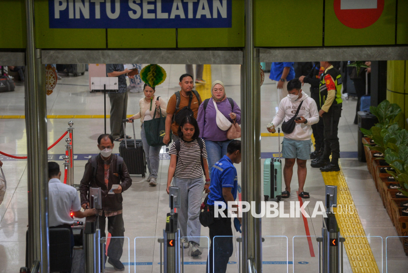 Penumpang berjalan untuk memasuki peron di Stasiun Gambir, Jakarta, Selasa (17/3/2026). Berdasarkan data KAI Daop 1 Jakarta per 17 Maret 2026 pukul 18.00 WIB, jumlah penumpang yang berangkat dari Stasiun Gambir mencapai 18.250 orang atau mengalami kenaikan sebesar 4,4 persen. KAI Daop 1 Jakarta menyediakan total kapasitas tempat duduk pada masa Angkutan Lebaran 2026 sebanyak 1.083.623 kursi. (FOTO : Republika/Prayogi)