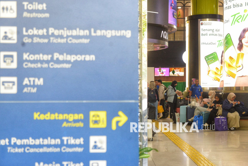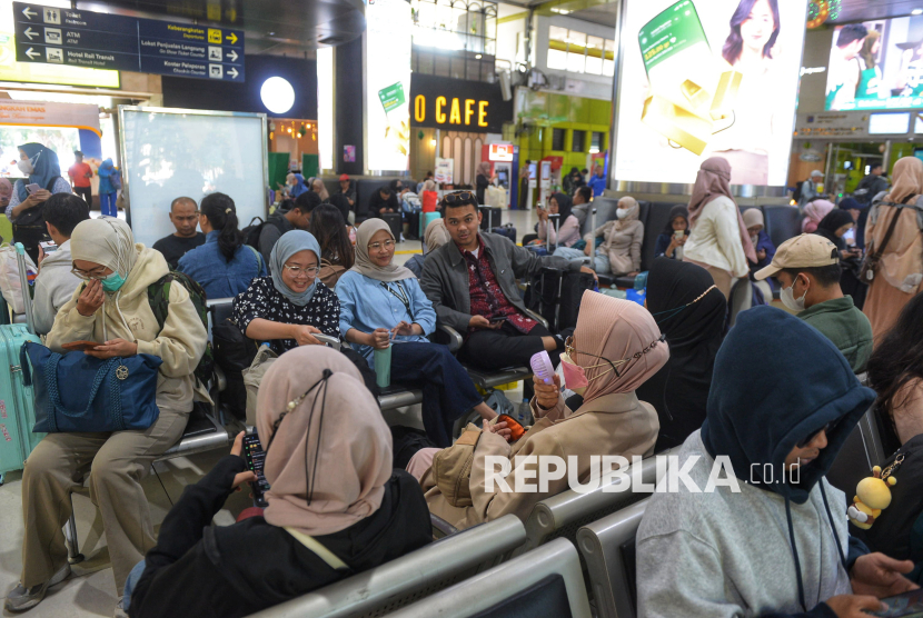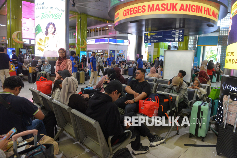 Penumpang menunggu jadwal keberangkatan kereta di Stasiun Gambir, Jakarta, Selasa (17/3/2026). Berdasarkan data KAI Daop 1 Jakarta per 17 Maret 2026 pukul 18.00 WIB, jumlah penumpang yang berangkat dari Stasiun Gambir mencapai 18.250 orang atau mengalami kenaikan sebesar 4,4 persen. KAI Daop 1 Jakarta menyediakan total kapasitas tempat duduk pada masa Angkutan Lebaran 2026 sebanyak 1.083.623 kursi. (FOTO : Republika/Prayogi)