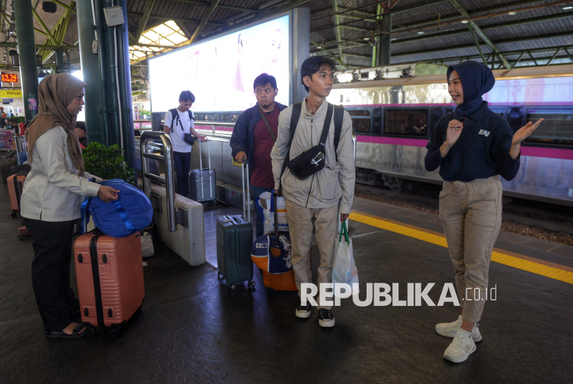 Penumpang mendapatkan informasi keberangkatan kereta di Stasiun Gambir, Jakarta, Selasa (17/3/2026). Berdasarkan data KAI Daop 1 Jakarta per 17 Maret 2026 pukul 18.00 WIB, jumlah penumpang yang berangkat dari Stasiun Gambir mencapai 18.250 orang atau mengalami kenaikan sebesar 4,4 persen. KAI Daop 1 Jakarta menyediakan total kapasitas tempat duduk pada masa Angkutan Lebaran 2026 sebanyak 1.083.623 kursi. (FOTO : Republika/Prayogi)