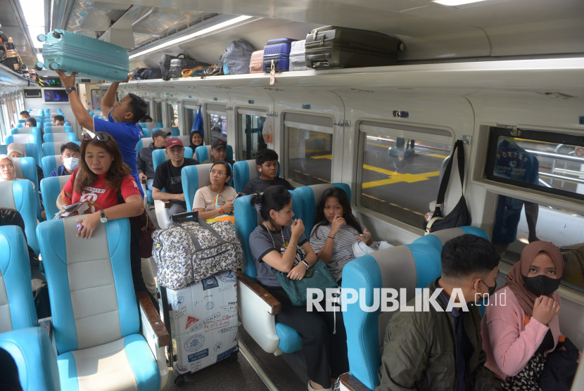 Penumpang berada dalam gerbong kereta yang siap untuk diberangkatkan di Stasiun Gambir, Jakarta, Selasa (17/3/2026). Berdasarkan data KAI Daop 1 Jakarta per 17 Maret 2026 pukul 18.00 WIB, jumlah penumpang yang berangkat dari Stasiun Gambir mencapai 18.250 orang atau mengalami kenaikan sebesar 4,4 persen. KAI Daop 1 Jakarta menyediakan total kapasitas tempat duduk pada masa Angkutan Lebaran 2026 sebanyak 1.083.623 kursi. (FOTO : Republika/Prayogi)