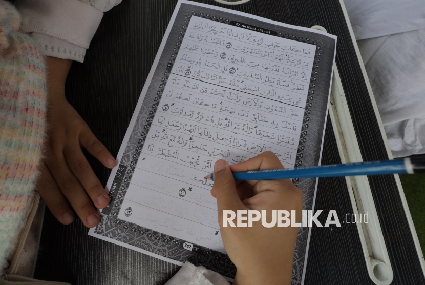 REPUBLIKA.CO.ID, KEDIRI Pelajar menebalkan khat mushaf Alquran pada kegiatan Gerakan Literasi Mushaf Alquran di Kota Kediri, Jawa Timur, Senin (9/3/2026).