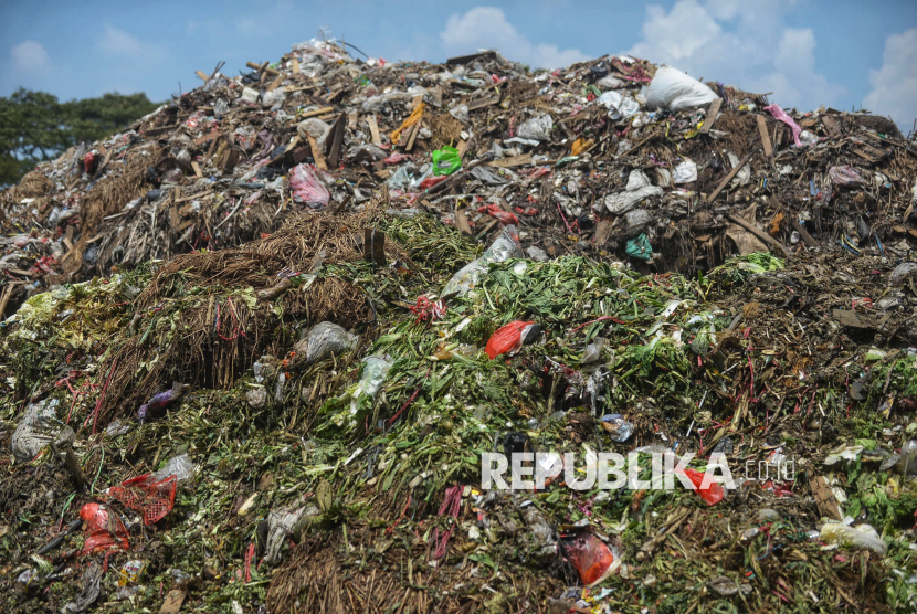 Tumpukan sampah di Pasar Induk Kramat Jati, Jakarta, Rabu (1/4/2026). Hingga saat ini, kondisi sampah masih tampak menggunung dengan ketinggian yang mencapai sekitar enam meter. Tumpukan sampah tersebut didominasi oleh sampah sayuran dan buah. Berdasarkan pantauan Republika di lokasi sejak pukul 10.45 hingga 11.45 WIB, belum terlihat adanya truk yang mengangkut sampah untuk dibuang ke lokasi pengolahan selanjutnya maupun ke TPST Bantargebang. Sejumlah pedagang mengeluhkan kondisi tersebut karena dinilai mengganggu aktivitas dan kenyamanan di area pasar. (FOTO : Republika/Prayogi)