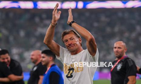 Pelatih Arab Saudi Herve Renard memberikan salam kepada suporter seusai pertandingan kualifikasi Piala Dunia 2026 putaran keempat Grup B sepak bola Asia melawan Irak di Stadion Alinma Bank di King Abdullah Sports City, Jeddah, Arab Saudi, Rabu (15/10/2025). Tim nasional Arab Saudi memastikan satu tempat di putaran final Piala Dunia 2026 setelah bermain imbang tanpa gol 0-0 melawan Irak. (FOTO : AP Photo)