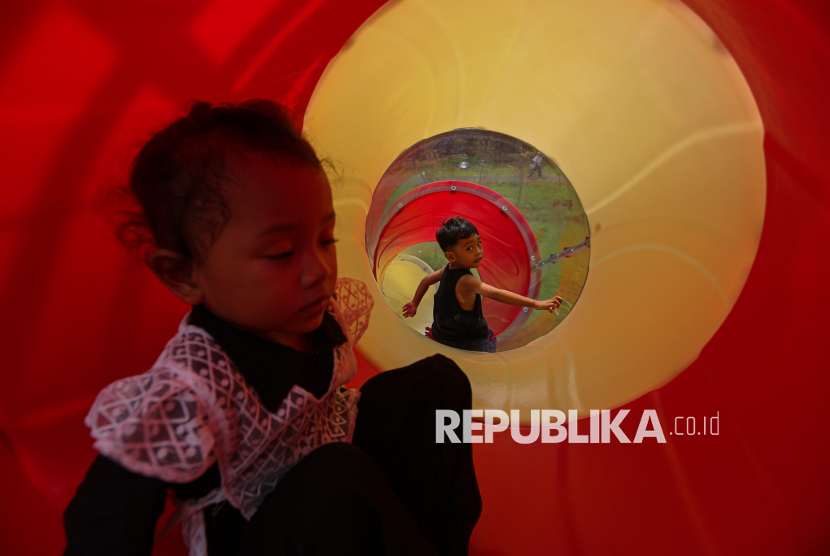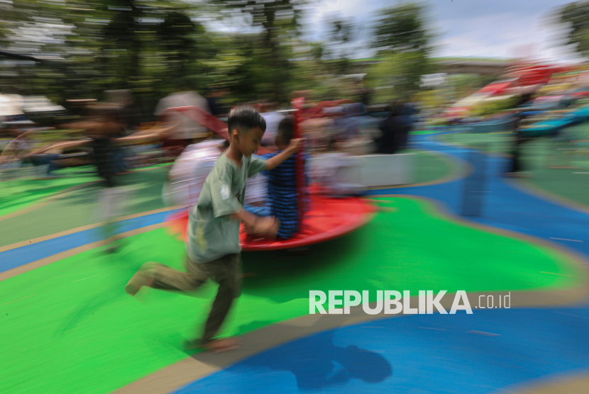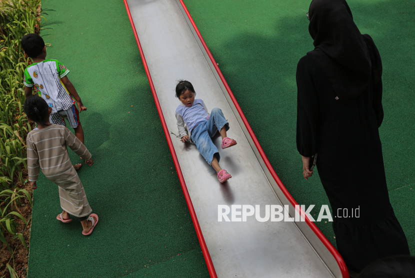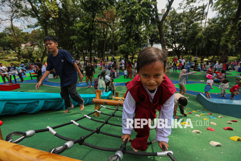 Anak bermain didampingi orang tuanya saat berkunjung ke ruang terbuka hijau (RTH) Taman Bendera Pusaka, Kebayoran Baru, Jakarta Selatan, Senin (23/3/2026). Taman Bendera Pusaka menjadi destinasi wisata baru ramah anak dan gratis yang dapat dimanfaatkan untuk berwisata pada hari libur lebaran idul fitri di Jakarta. Taman yang baru diresmikan oleh Gubernur DKI Jakarta, Pramono Anung tersebut menyediakan sejumlah fasilitas seperti area jogging track, playground anak, kolam, lapangan basket, jembatan hingga lapangan padel. (FOTO : Republika/Thoudy Badai)