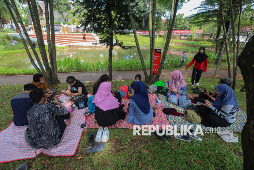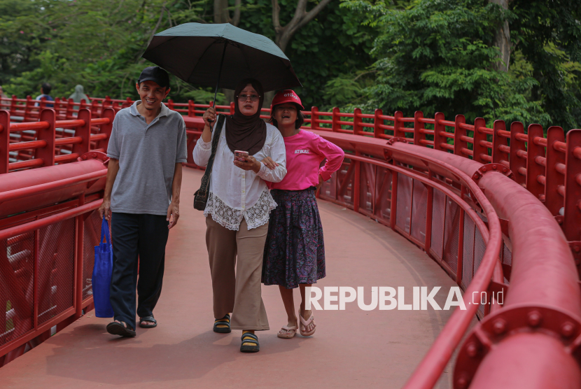 REPUBLIKA.CO.ID, JAKARTA -- Pengunjung berwisata di ruang terbuka hijau (RTH) Taman Bendera Pusaka, Kebayoran Baru, Jakarta Selatan, Senin (23/3/2026).