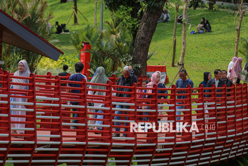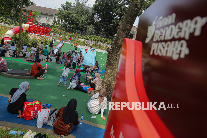 Pengunjung berwisata di ruang terbuka hijau (RTH) Taman Bendera Pusaka, Kebayoran Baru, Jakarta Selatan, Senin (23/3/2026). Taman Bendera Pusaka menjadi destinasi wisata baru ramah anak dan gratis yang dapat dimanfaatkan untuk berwisata pada hari libur lebaran idul fitri di Jakarta. Taman yang baru diresmikan oleh Gubernur DKI Jakarta, Pramono Anung tersebut menyediakan sejumlah fasilitas seperti area jogging track, playground anak, kolam, lapangan basket, jembatan hingga lapangan padel. (FOTO : Republika/Thoudy Badai)