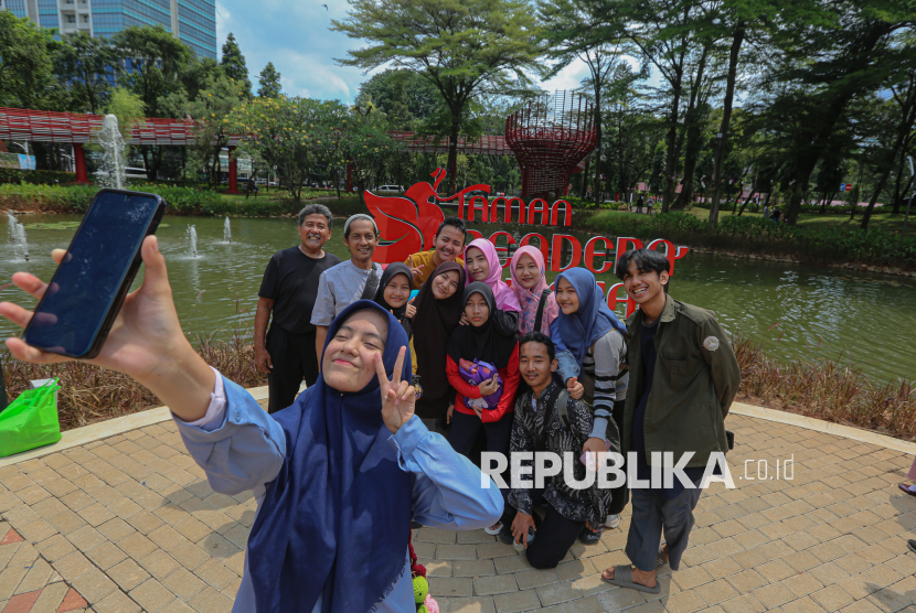 Pengunjung berswafoto saat berwisata di ruang terbuka hijau (RTH) Taman Bendera Pusaka, Kebayoran Baru, Jakarta Selatan, Senin (23/3/2026). Taman Bendera Pusaka menjadi destinasi wisata baru ramah anak dan gratis yang dapat dimanfaatkan untuk berwisata pada hari libur lebaran idul fitri di Jakarta. Taman yang baru diresmikan oleh Gubernur DKI Jakarta, Pramono Anung tersebut menyediakan sejumlah fasilitas seperti area jogging track, playground anak, kolam, lapangan basket, jembatan hingga lapangan padel. (FOTO : Republika/Thoudy Badai)