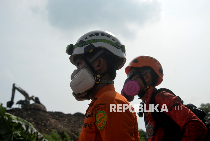 Tim SAR gabungan melakukan pencarian korban longsor di Tempat Pengolahan Sampah Terpadu (TPST) Bantargebang, Bekasi, Jawa Barat, Senin (9/3/2026). Berdasarkan data sementara dari Basarnas DKI Jakarta pada Senin (9/3) sore, sebanyak enam orang meninggal dunia dan satu lainnya masih dalam proses pencarian akibat longsor di TPST Bantargebang yang terjadi pada Ahad (8/3). (FOTO : Edwin Putranto/Republika)