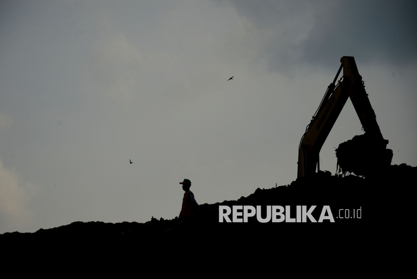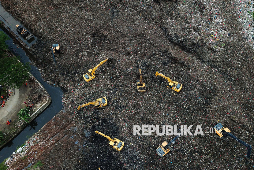 Alat berat dikerahkan dalam proses pencarian korban longsor di Tempat Pengolahan Sampah Terpadu (TPST) Bantargebang, Bekasi, Jawa Barat, Senin (9/3/2026). Berdasarkan data sementara dari Basarnas DKI Jakarta pada Senin (9/3) sore, sebanyak enam orang meninggal dunia dan satu lainnya masih dalam proses pencarian akibat longsor di TPST Bantargebang yang terjadi pada Ahad (8/3). (FOTO : Edwin Putranto/Republika)