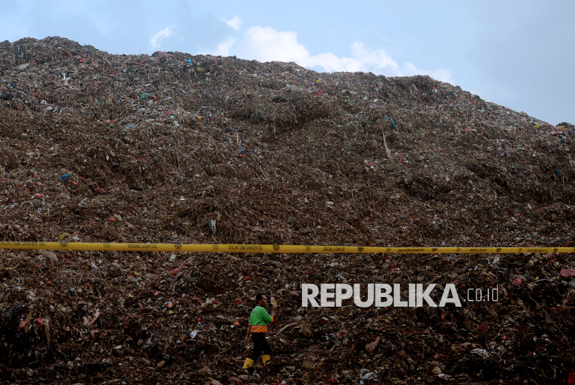 Petugas melintas di Tempat Pengolahan Sampah Terpadu (TPST) Bantargebang, Bekasi, Jawa Barat, Senin (9/3/2026), saat berlangsungnya proses pencarian korban longsor. Berdasarkan data sementara dari Basarnas DKI Jakarta pada Senin (9/3) sore, sebanyak enam orang meninggal dunia dan satu lainnya masih dalam proses pencarian akibat longsor di TPST Bantargebang yang terjadi pada Ahad (8/3). (FOTO : Edwin Putranto/Republika)