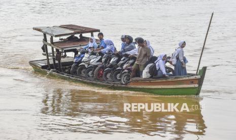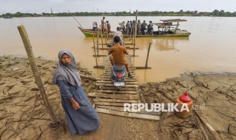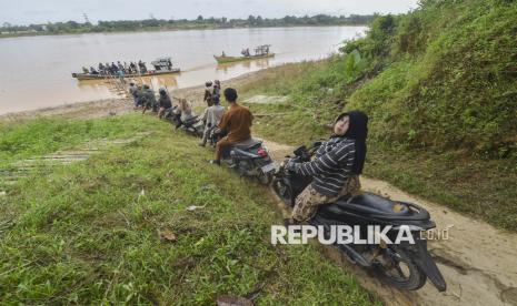 REPUBLIKA.CO.ID, JAMBI -- Pengendara sepeda motor dan warga mengantre untuk menaiki perahu saat akan menyeberangi Sungai Batanghari dari Desa Keranggan menuju Desa Berembang di Sekernan, Muaro Jambi, Jambi, Senin (20/10/2025).